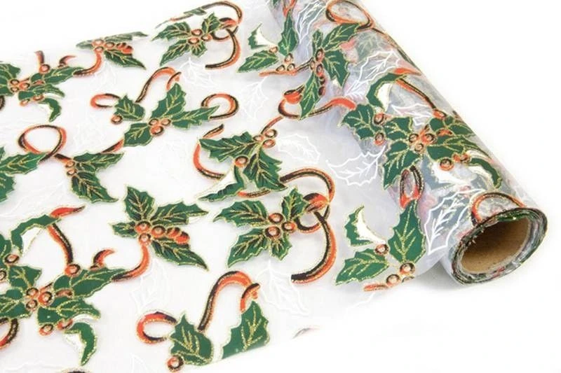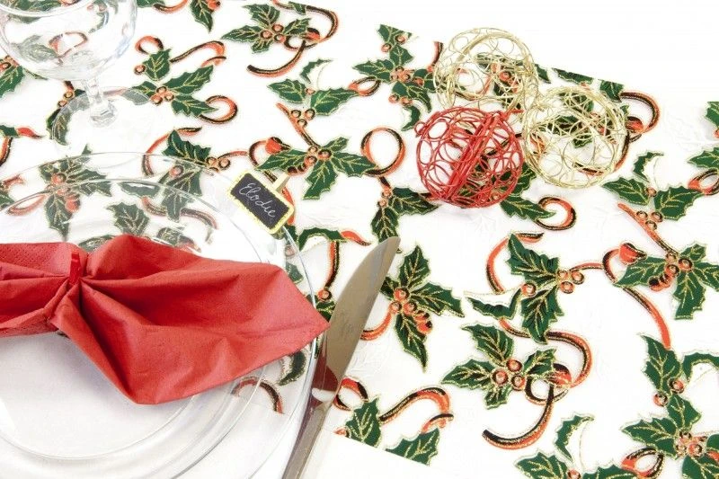 Chemin de table Noël en Organza avec décos Houx, avec un très beau rendu.