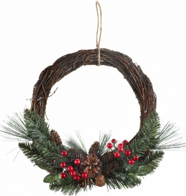 Composition en bois (couronne en bois et pommes de pin naturelles), en plastique (baies rouges et sapin) et corde avec feuillages pailletés, baies, pommes de pin et branchages naturels, de forme ronde et de 32 cm de diamètre, et jusqu’à 14 cm d’épaisseur environ.