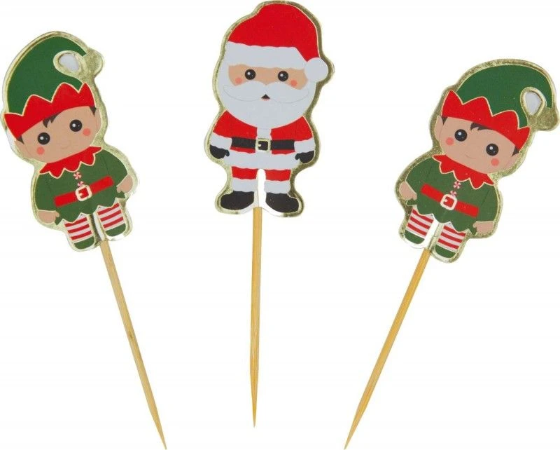 Il s’agit de petits pics en bois d’environ 10 cm surmontés d’un père noël (5 pics) et d’un lutin (5 pics).