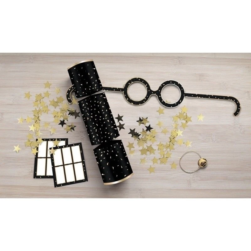 Chaque cracker contient des confettis étoiles, un charms pour verre, 2 planches de minis Stickers (étiquettes pour personnaliser son verre, un cadeau …) et une paire de lunettes en carton.