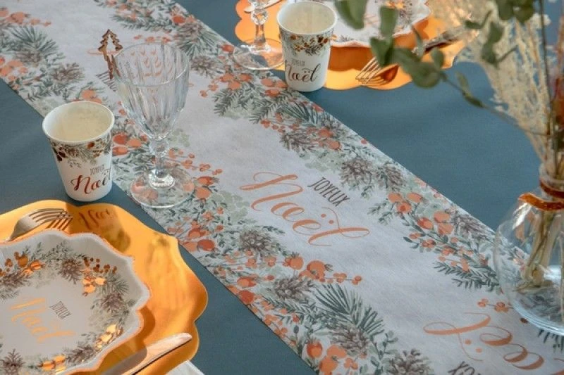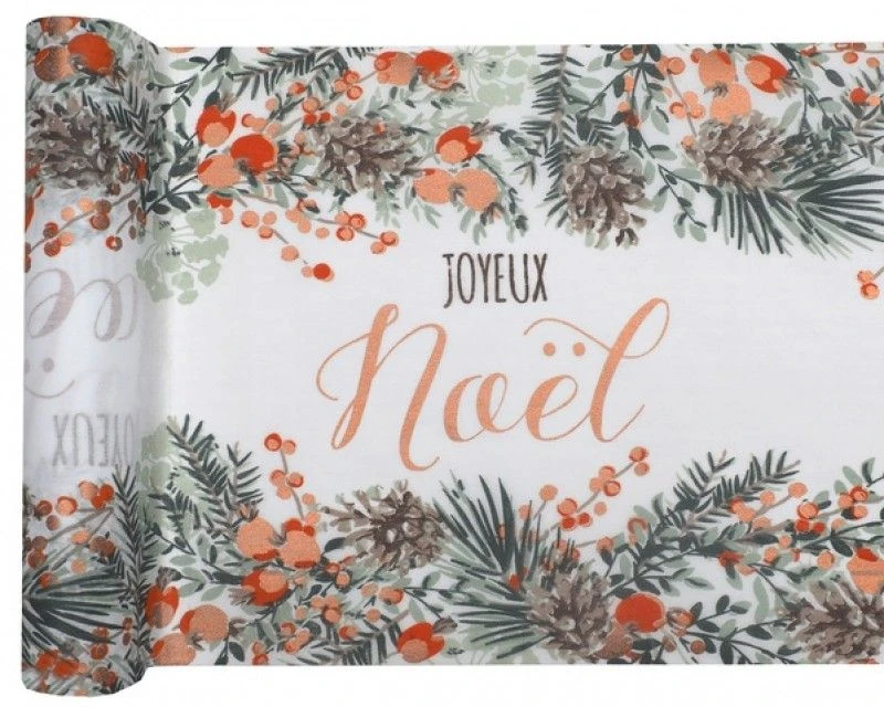 Il est blanc avec illustrations guirlandes de Noël comportant des pommes de pin et branches.