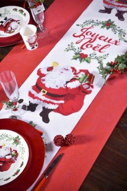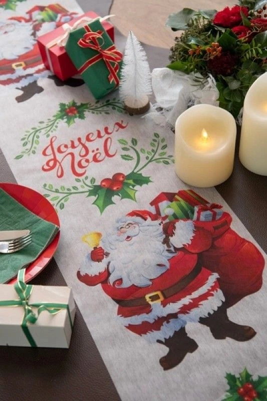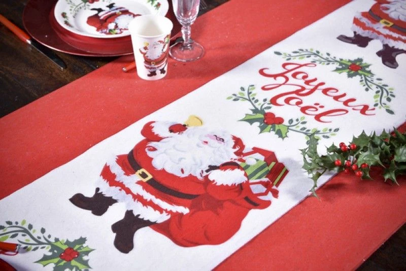 Chemin en tissu intissé polyester illustré Père Noël et Joyeux Noël.
